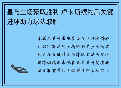 本篇文章将围绕皇马在主场取得胜利的比赛进行分析,特别是卢卡斯续约后在关键时刻为球队打进决定性进球的精彩表现。首先,文章将简要概括比赛背景和关键事件,然后从四个方面深入探讨这场胜利的内涵,包括球队的整体...