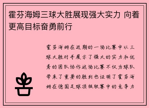 霍芬海姆在近期的一场比赛中,以三球大胜对手,展示了强大的实力和优秀的团队协作。这场比赛不仅为球队带来了重要的胜利,也证明了霍芬海姆在德国足球顶级联赛中的竞争力。通过这场精彩的胜利,球队不仅展示了他们的...