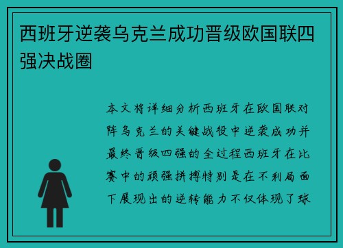 本文将详细分析西班牙在欧国联对阵乌克兰的关键战役中逆袭成功并最终晋级四强的全过程。西班牙在比赛中的顽强拼搏,特别是在不利局面下展现出的逆转能力,不仅体现了球队的实力,也反映了其整体战术的高效性和球员的...